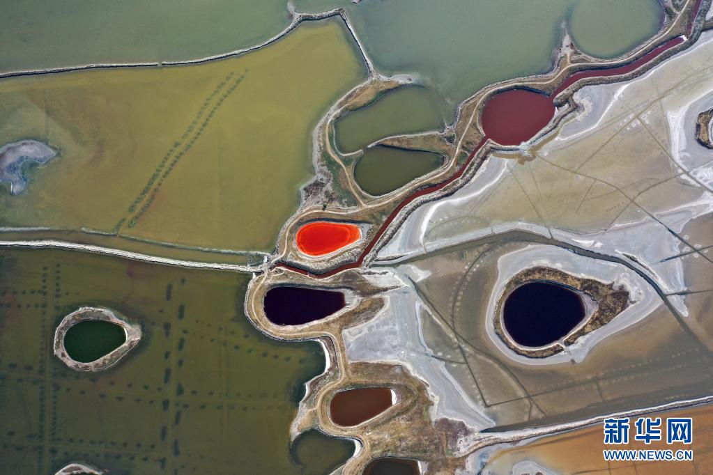 近日,隨著氣溫不斷升高,山西運(yùn)城鹽湖呈現(xiàn)五彩斑斕的景象。