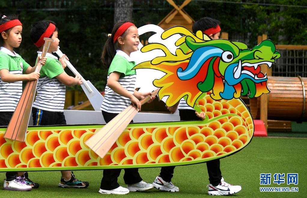 6月10日,石家莊市橋西區(qū)第三幼兒園的小朋友們在進(jìn)行劃“龍舟”比賽。