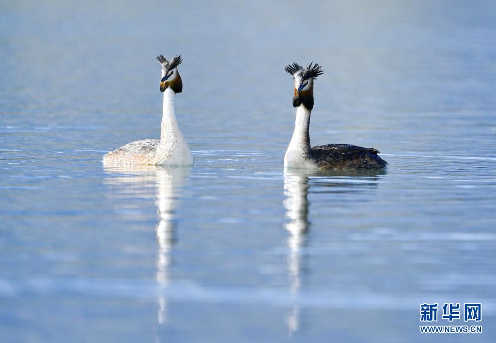 6月14日在拉魯濕地拍攝的兩只鳳頭??。夏日里,鳳頭??和小??在西藏拉薩拉魯濕地國(guó)家級(jí)自然保護(hù)區(qū)水面上嬉戲。新華社記者 張汝鋒 攝