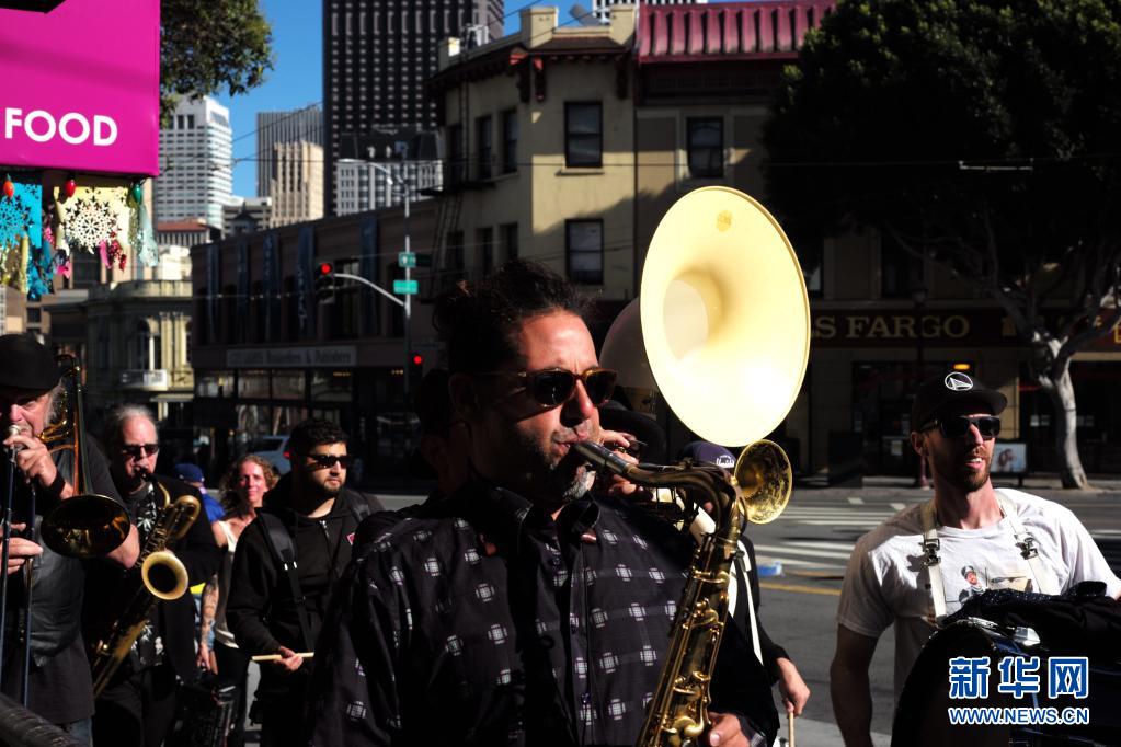 6月15日,一支樂(lè)隊(duì)在美國(guó)加利福尼亞州舊金山街頭演奏。
