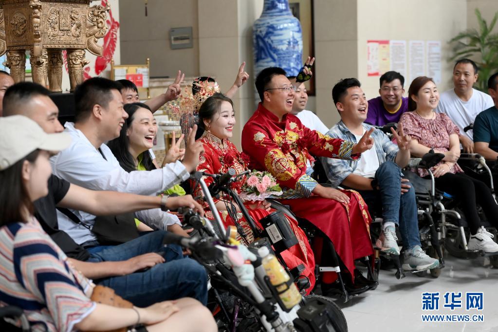 新郎周海云、新娘關(guān)美和親友們?cè)诨槎Y上合影(6月15日攝)。新華社發(fā)(劉亮亮攝)