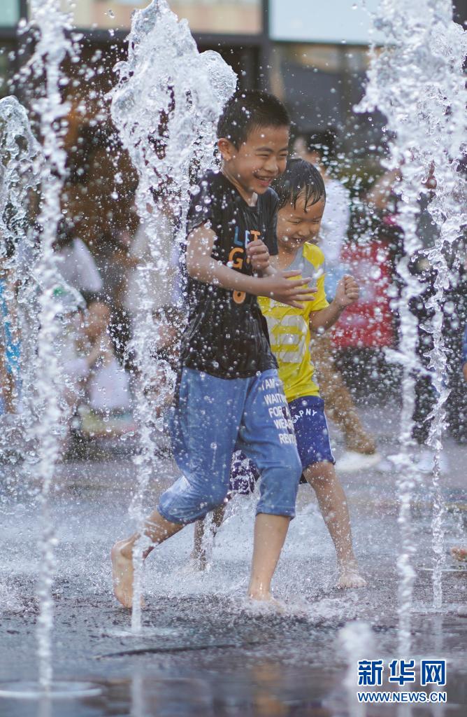 6月20日,孩子們在北京華熙LIVE·五棵松商業(yè)街區(qū)一處噴泉戲水。