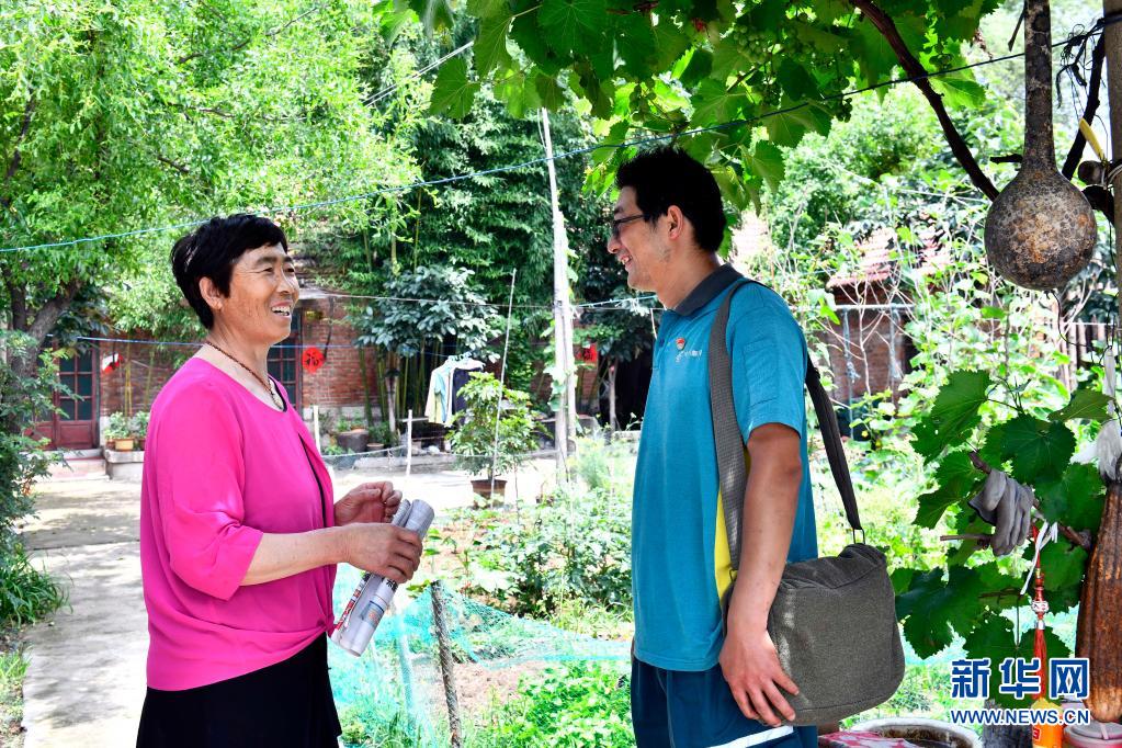 6月20日,在微山縣南陽(yáng)鎮(zhèn),郵遞員王少朋(右)和柳溝村村民交談。
