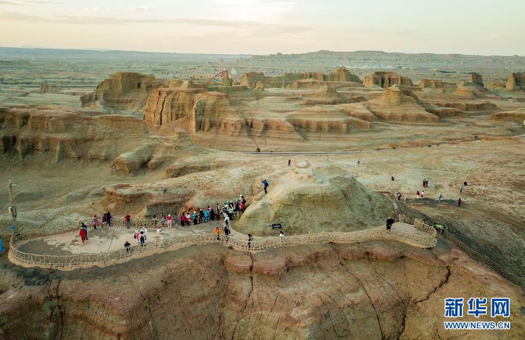 游客在新疆克拉瑪依烏爾禾世界魔鬼城景區(qū)內欣賞日落(6月21日攝,無人機照片)。