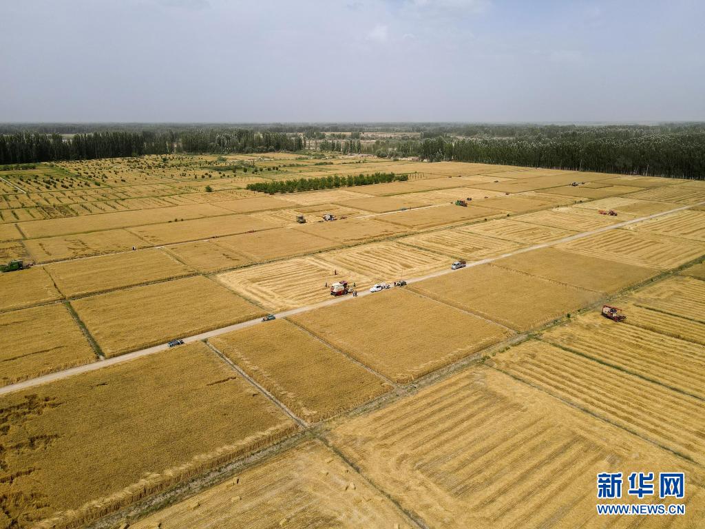 6月19日,空中俯瞰麥客阿地力·沙拉木工作的新疆庫車市齊滿鎮(zhèn)的麥?zhǔn)宅F(xiàn)場(無人機(jī)照片)。新華社記者 高晗 攝
