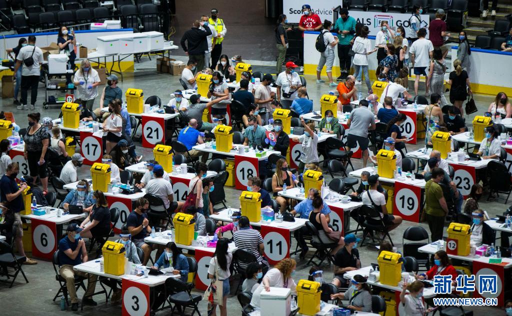 6月27日,在加拿大多倫多,人們?cè)诖笮托鹿谝呙缃臃N中心接種疫苗。