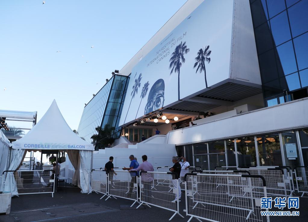7月5日,工作人員在法國(guó)戛納的電影宮外為開(kāi)幕式做準(zhǔn)備。