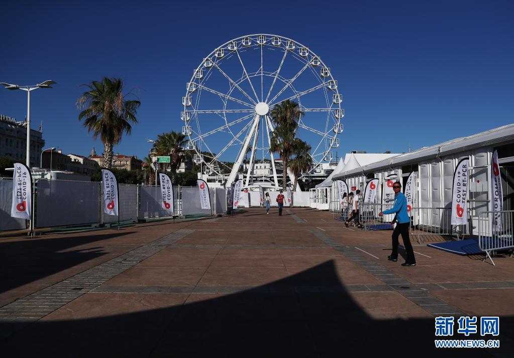 這是7月5日在法國戛納拍攝的為電影節(jié)注冊人員設立的新冠病毒檢測點。