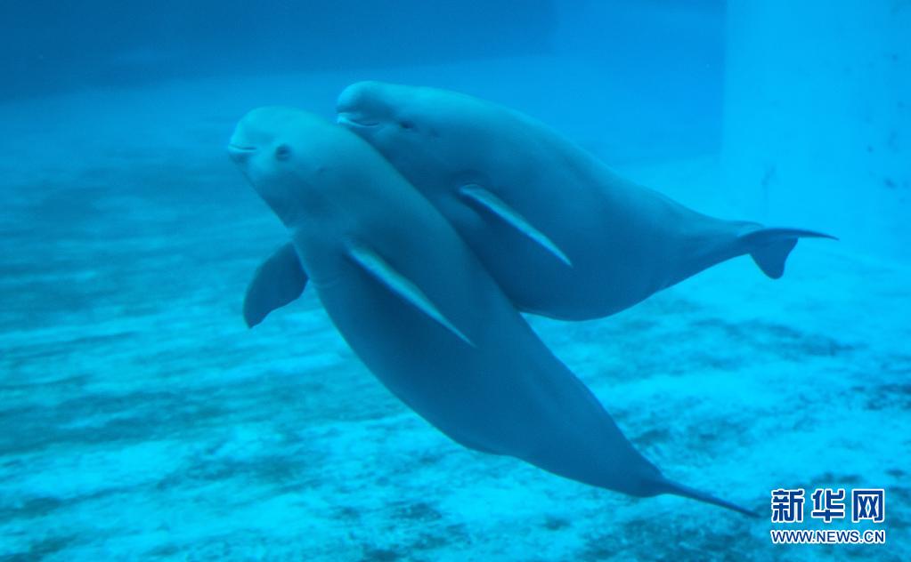 7月5日,江豚媽媽洋洋和小江豚YYC在水中游動。新華社記者肖藝九攝