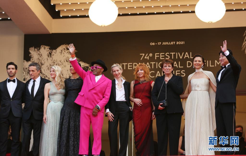 7月6日,第74屆法國戛納國際電影節(jié)主競(jìng)賽單元評(píng)委會(huì)主席、美國導(dǎo)演和制片人斯派克·李(左五)攜主競(jìng)賽單元評(píng)委出席開幕式紅毯。