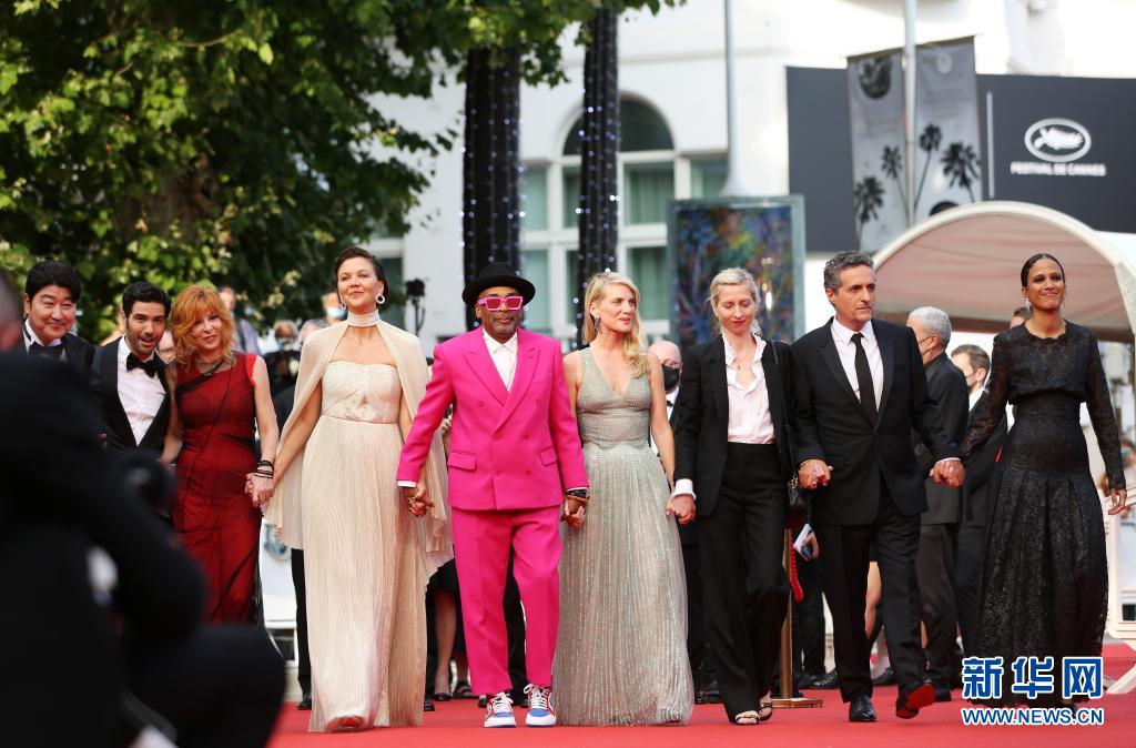 7月6日,第74屆法國戛納國際電影節(jié)主競賽單元評委會主席、美國導演和制片人斯派克·李(中)攜主競賽單元評委出席開幕式紅毯。