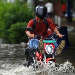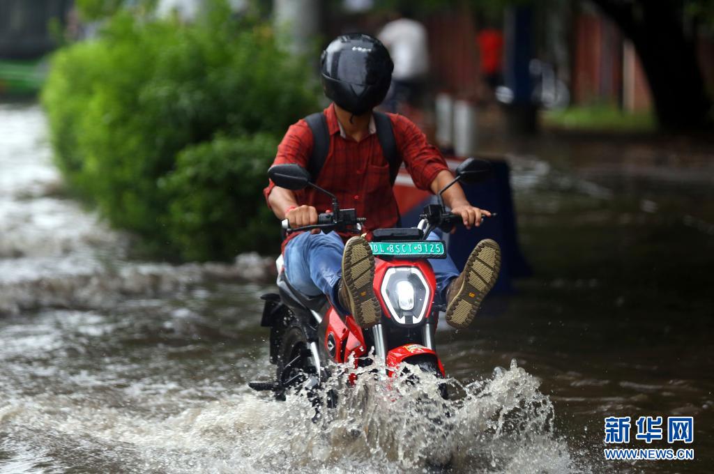 7月14日,一名男子在印度新德里積水的街道上騎行。