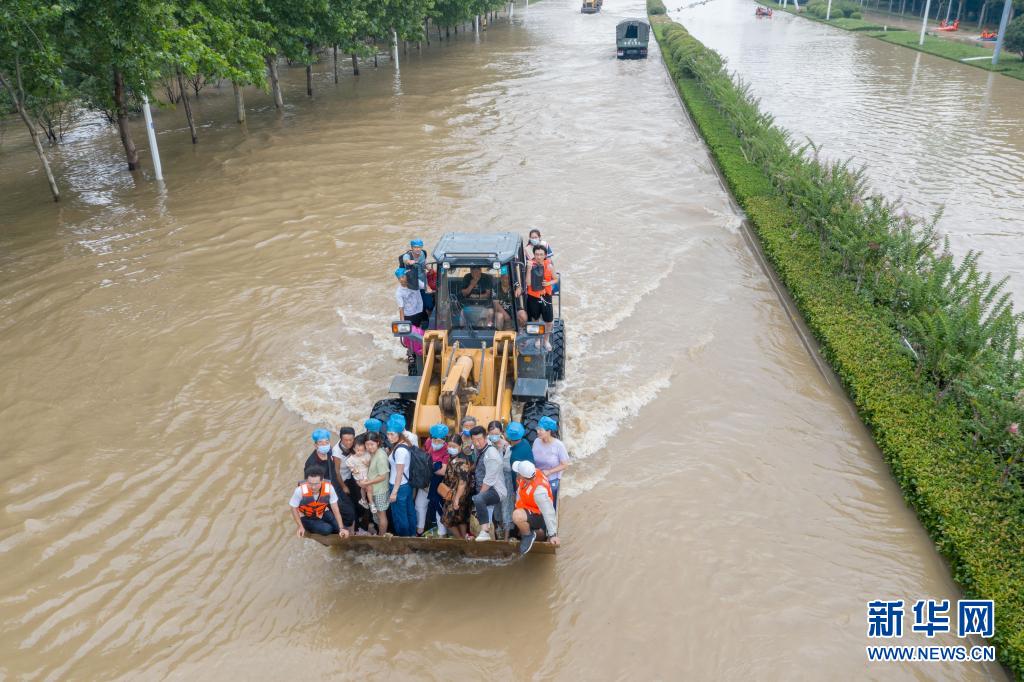7月22日,在阜外華中心血管病醫(yī)院附近的錦繡路與鄭開(kāi)大道交叉口,救援人員利用鏟車轉(zhuǎn)移人員(無(wú)人機(jī)照片)。