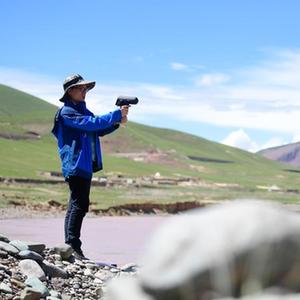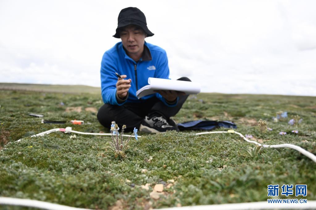 2021年長江源綜合科考的科考隊員任斐鵬在長江南源當曲地區(qū)觀察高寒草甸(7月23日攝)。