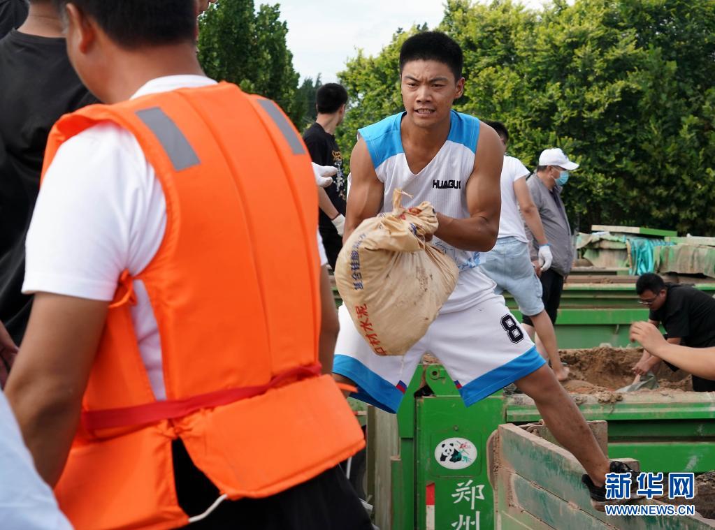 當日,在河南省鶴壁市浚縣傅莊堤上,不少群眾自發(fā)前來和救援人員一起裝沙袋、運沙袋,共筑堤壩。受持續(xù)強降雨影響,??h防汛形勢嚴峻,傅莊堤主要為浚縣縣城及26個村莊提供保護。新華社記者 李安 攝