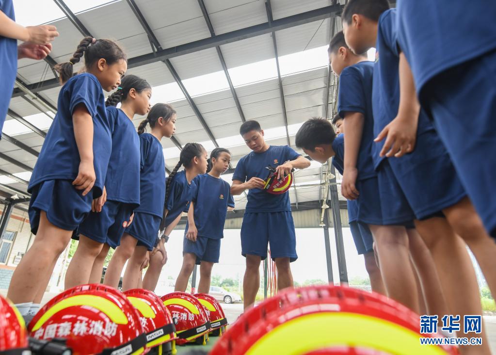 在四川省森林消防總隊特勤大隊,消防員王波平(中)給孩子們講解穿戴消防頭盔的注意事項(7月27日攝)。
