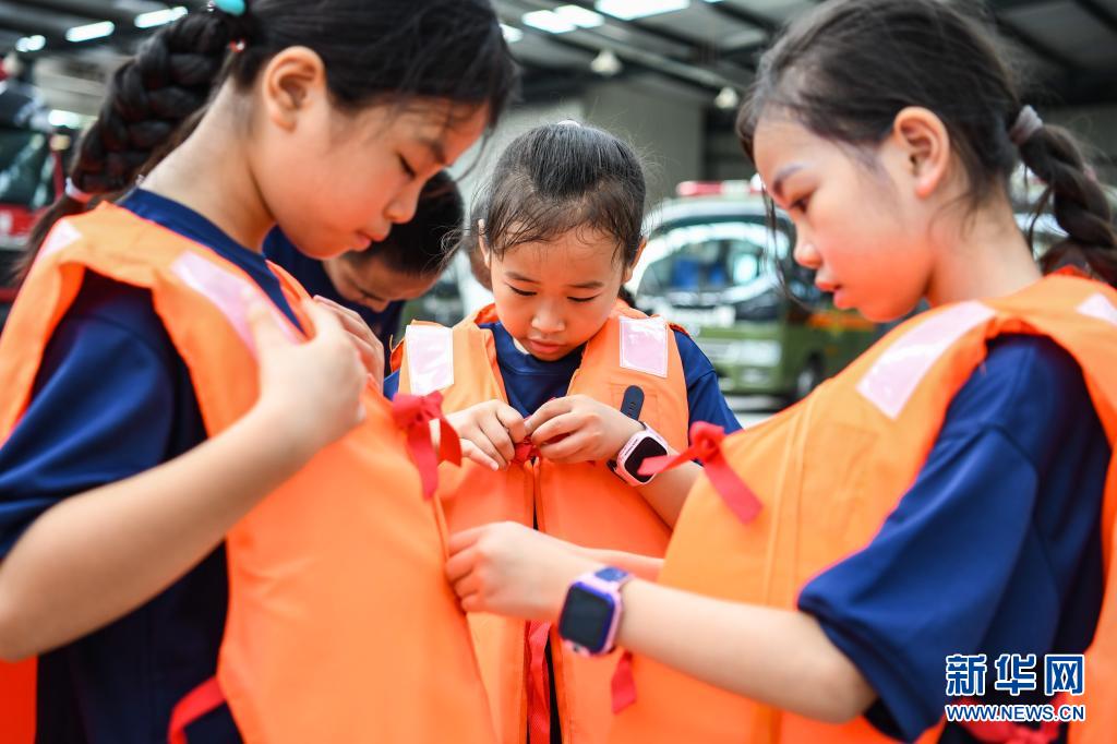 在四川省森林消防總隊特勤大隊,孩子們在練習穿救生衣(7月27日攝)。