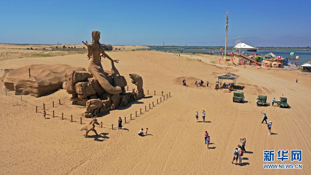 這是7月31日拍攝的寧夏沙湖景區(qū)內(nèi)的巨型沙雕景觀(無人機照片)。