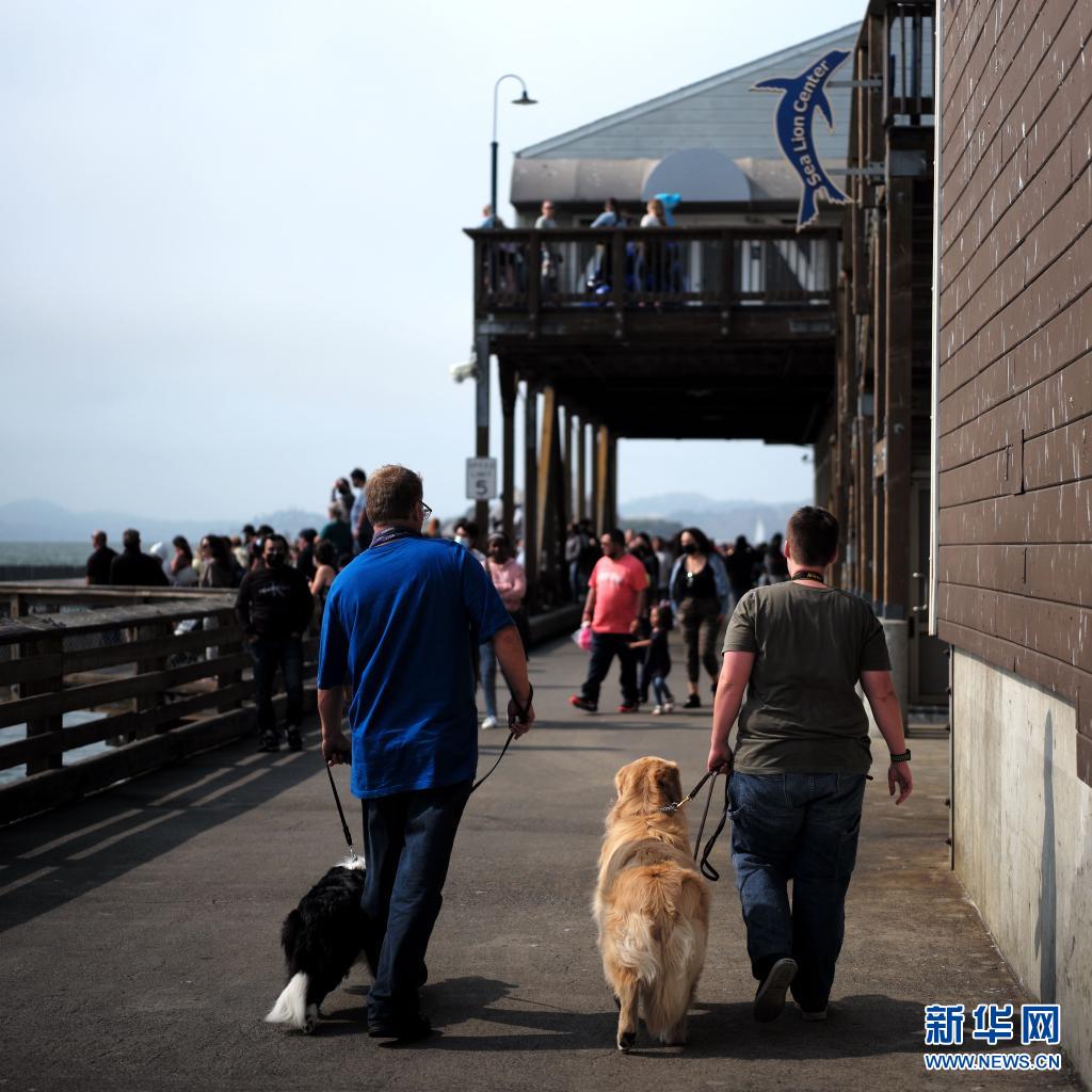 8月15日,人們?cè)诿绹?guó)舊金山海邊碼頭遛狗。