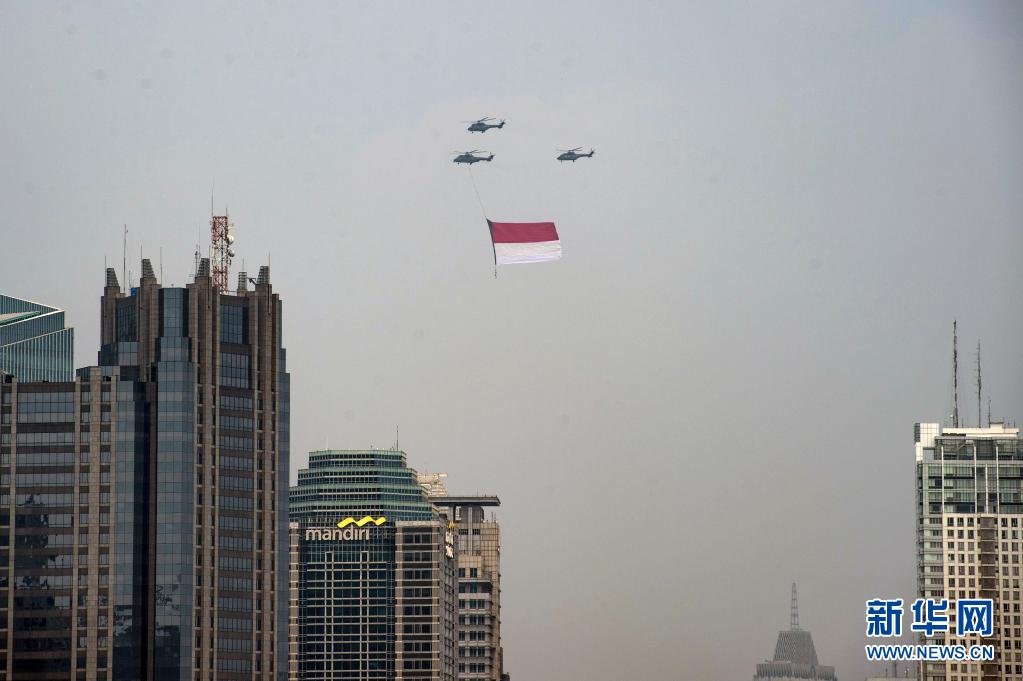 8月17日,懸掛印度尼西亞國(guó)旗的直升機(jī)飛過(guò)雅加達(dá)上空。8月17日是印度尼西亞獨(dú)立日。新華社發(fā)(維里攝)
