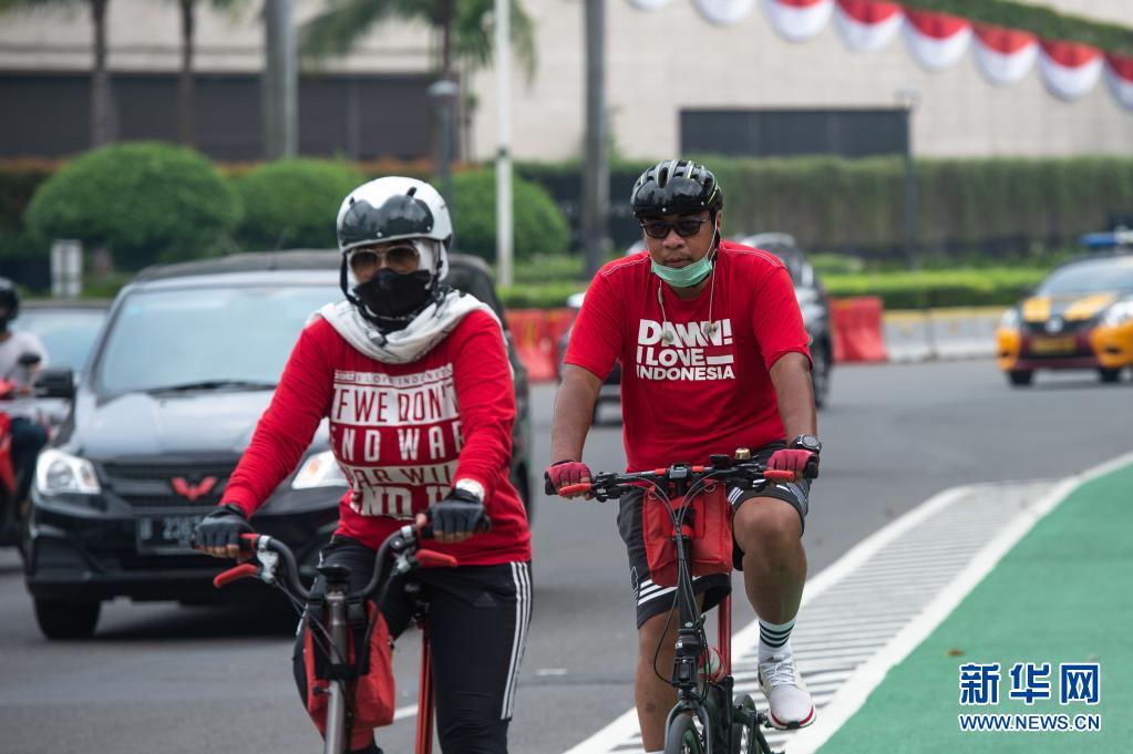 8月17日,人們身穿紅白配色服裝在雅加達街頭騎行,慶祝印度尼西亞獨立日。8月17日是印度尼西亞獨立日。新華社發(fā)(維里攝)