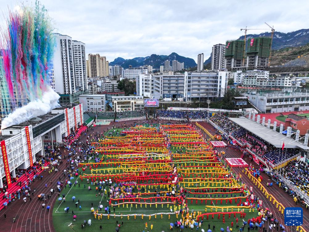这是2月27日拍摄的贵州省石阡县仡佬毛龙节开幕式现场(无人机照片)。