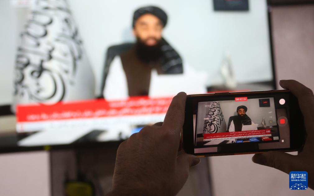 这是2月27日在阿富汗喀布尔拍摄的阿富汗政府发言人穆贾希德在新闻发布会上发言的电视画面。