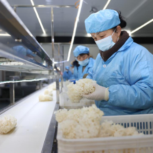 2月27日,河北省新河县众乐种植专业合作社工人在加工车间分拣绣球菌。