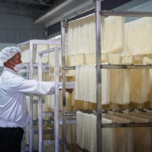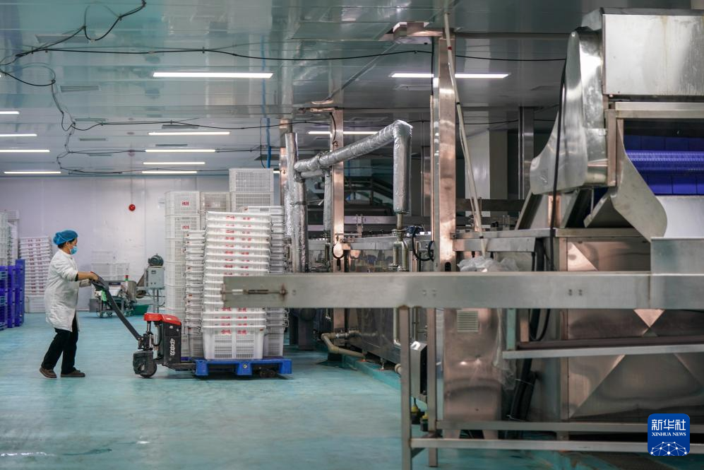 2月27日,蒙自市一家米线生产企业的工人在工厂内运输米线。