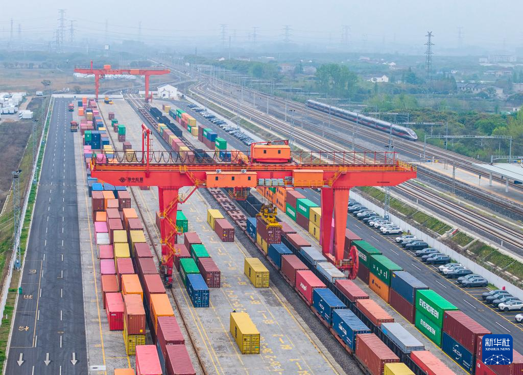 4月14日,在南京铁路物流中心江都物流基地内,大型起重设备将集装箱吊装到海铁联运列车,准备出口(无人机照片)。