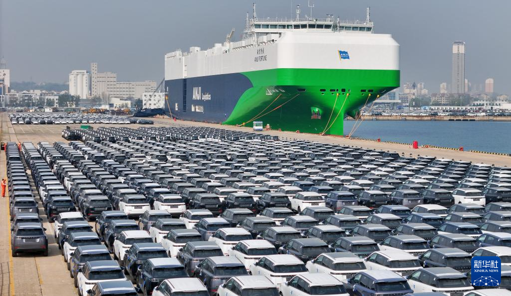 4月14日,国产汽车在山东港口烟台港等待装船出口(无人机照片)。