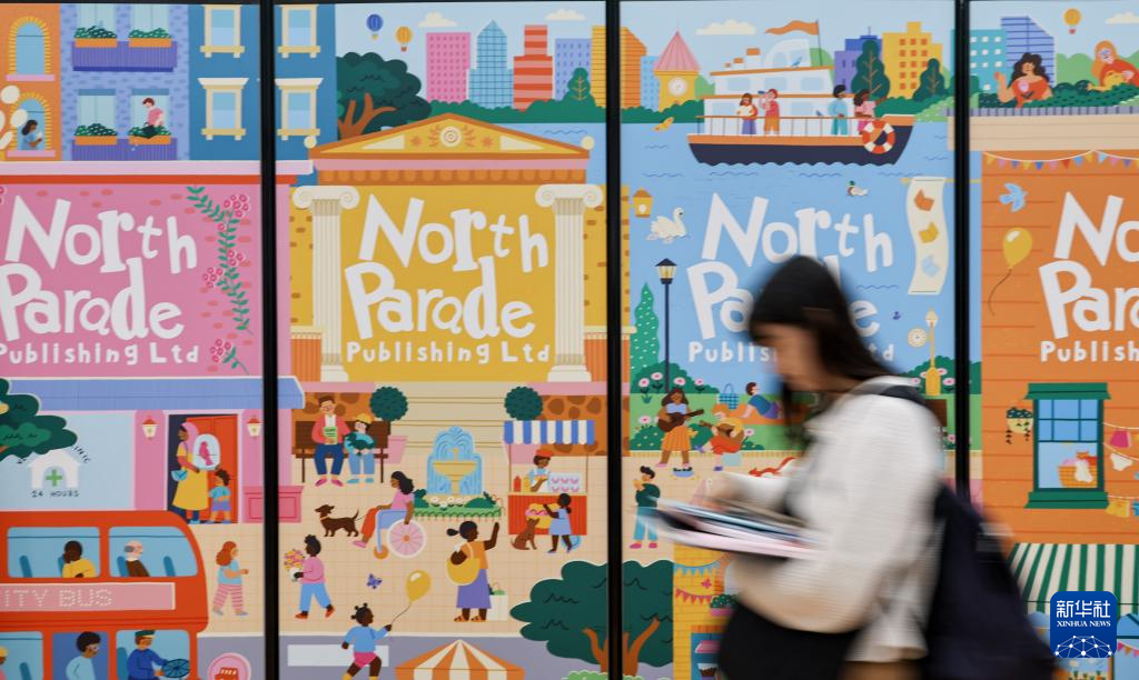 4月13日,在意大利博洛尼亚举行的博洛尼亚国际童书展上,观众从展会主题装饰墙前走过。
