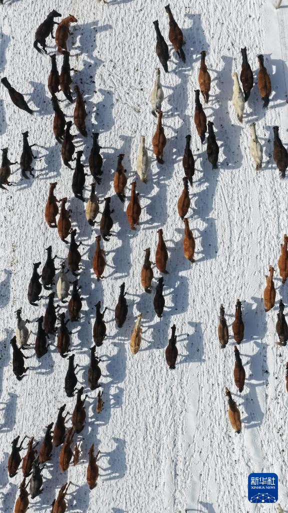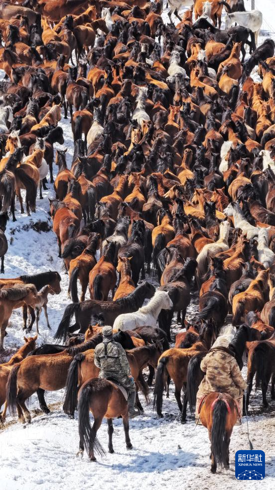 4月14日,山丹马场的牧马人组织马群转场(无人机照片)。