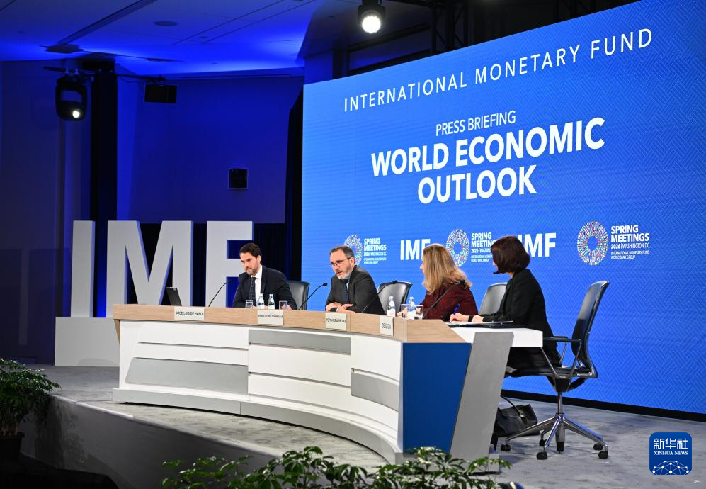 4月14日,在美国华盛顿,国际货币基金组织首席经济学家皮埃尔-奥利维耶·古兰沙(左二)出席最新一期《世界经济展望报告》的新闻发布会。