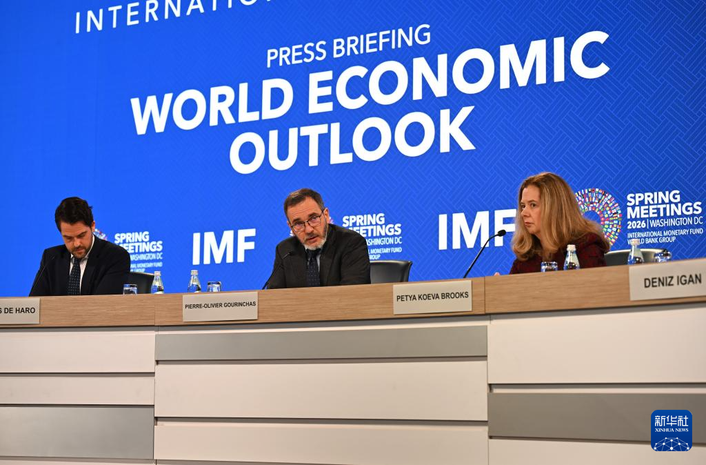 4月14日,在美国华盛顿,国际货币基金组织首席经济学家皮埃尔-奥利维耶·古兰沙(中)出席最新一期《世界经济展望报告》的新闻发布会。