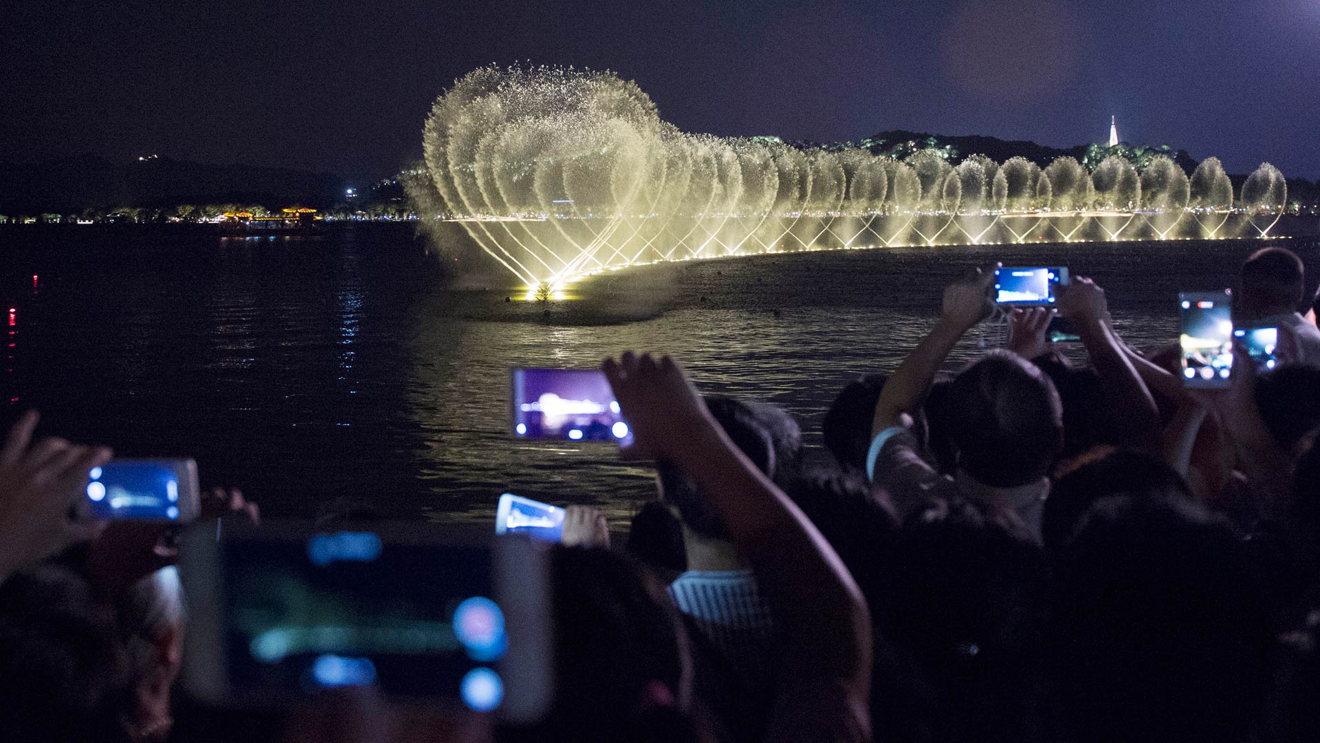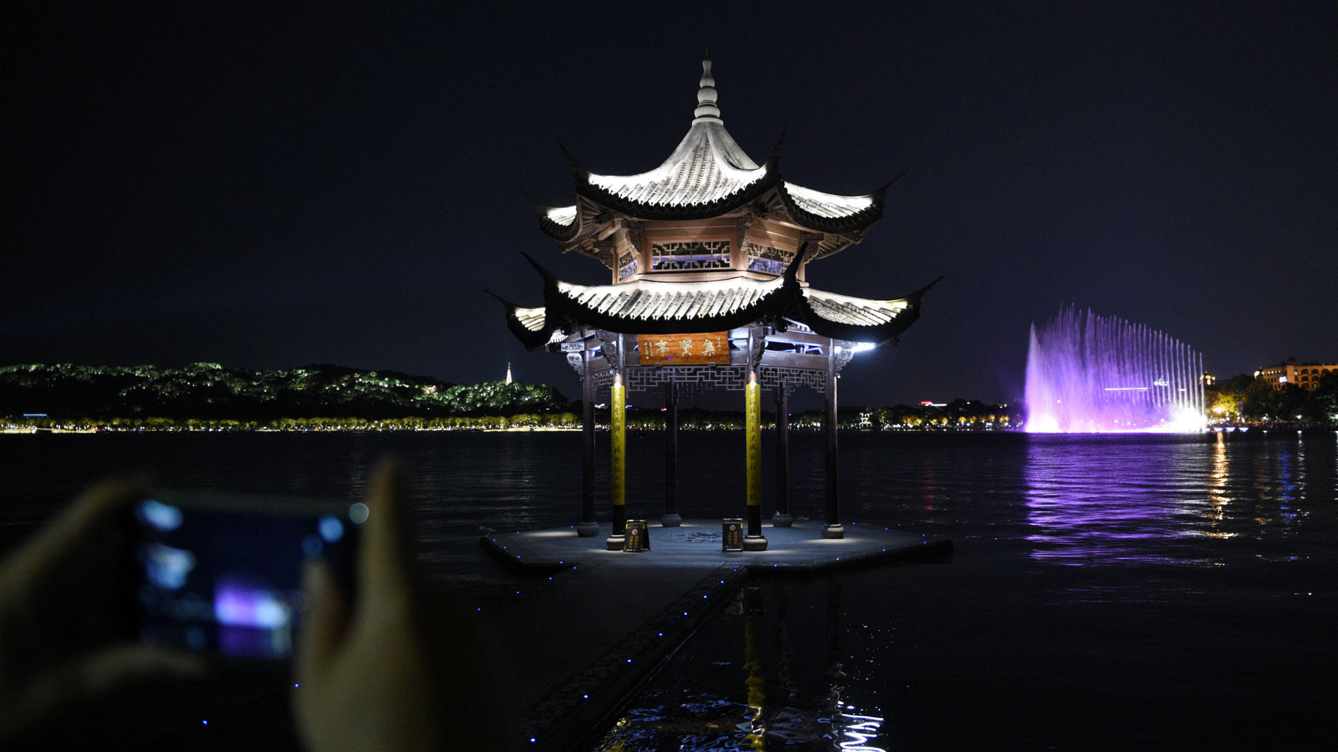 8月24日,游客在西湖邊欣賞西湖音樂噴泉。 2011年6月24日第35屆世界遺產(chǎn)大會審議表決,“杭州西湖文化景觀”入選世界遺產(chǎn)名錄。9月初,G20峰會將在杭州舉行,西湖這座承載了悠久文化的名湖也將迎來更多來自世界各地的客人。(新華社記者 鞠煥宗 攝)