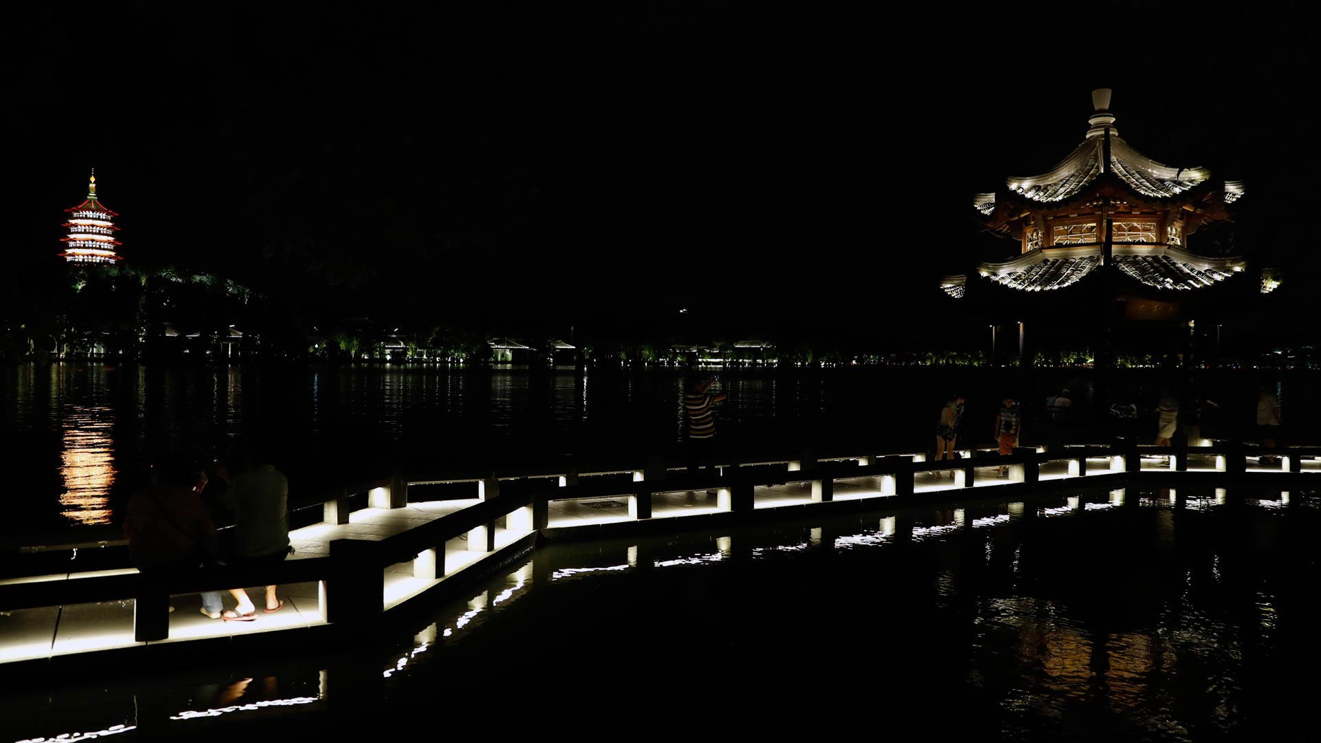 8月29日,游客在西湖集賢亭邊欣賞西湖夜色。傍晚的西湖邊,暮色與燈光交相輝映,市民和游客絡繹不絕。新華社記者 鞠煥宗 攝