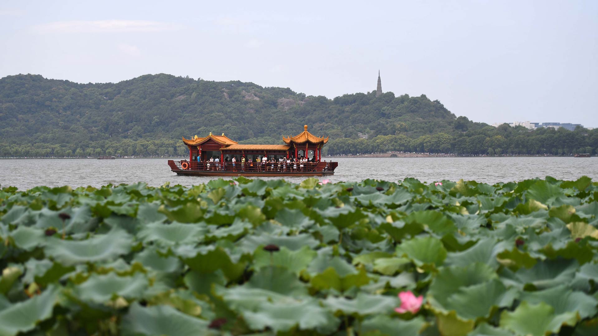 游客乘坐游船在西湖上游覽(8月27日攝)。 “三面云山一面城”,西湖的美麗自古就為眾多的作家和藝術家所稱頌?!拔骱啊北徽J為是“天人合一”最理想最經(jīng)典的景觀體現(xiàn)。(新華社記者 陳曄華 攝)