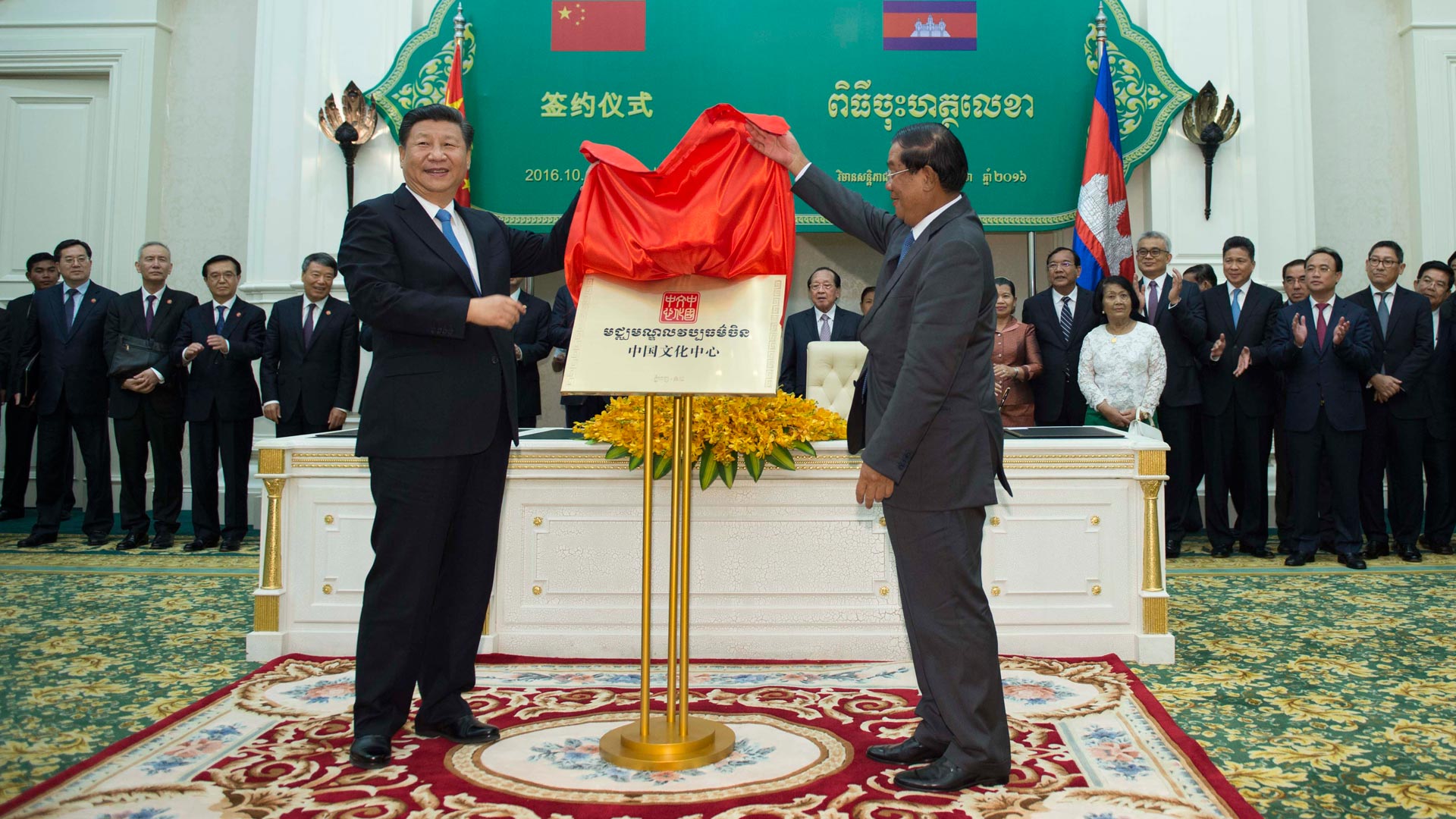 10月13日,國家主席習近平在金邊同柬埔寨首相洪森舉行會談。會談后,兩國領導人共同出席金邊中國文化中心揭牌儀式。 新華社記者 謝環(huán)馳 攝