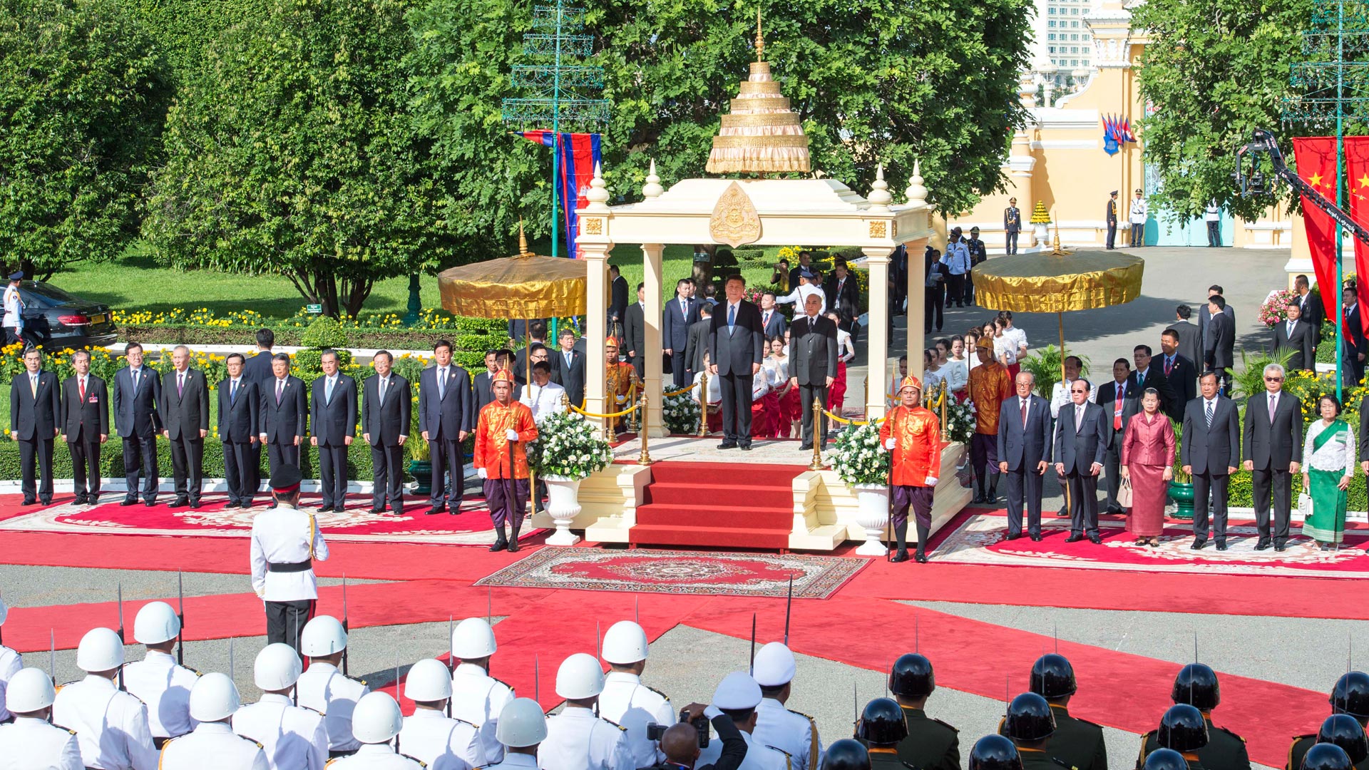 10月13日,國家主席習近平在金邊會見柬埔寨國王西哈莫尼。會見前,習近平出席西哈莫尼在王宮舉行的盛大歡迎儀式。 新華社記者 王曄 攝