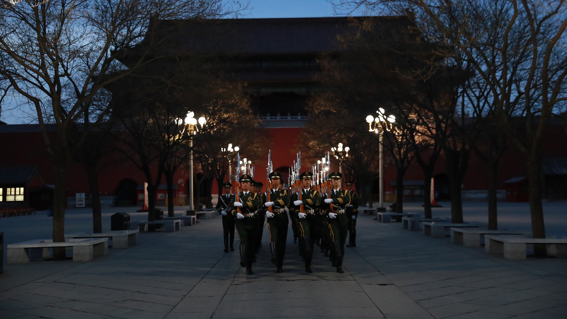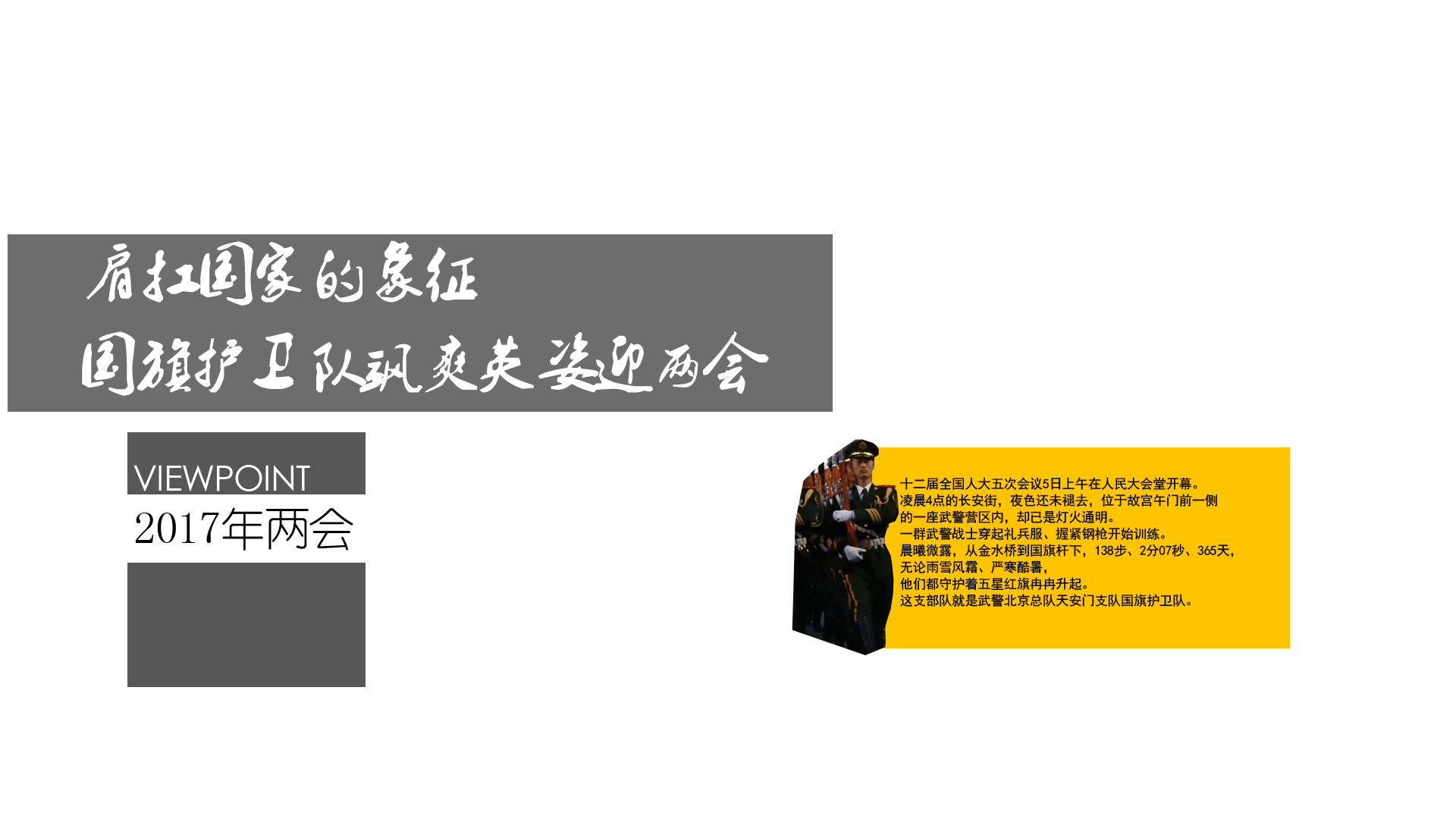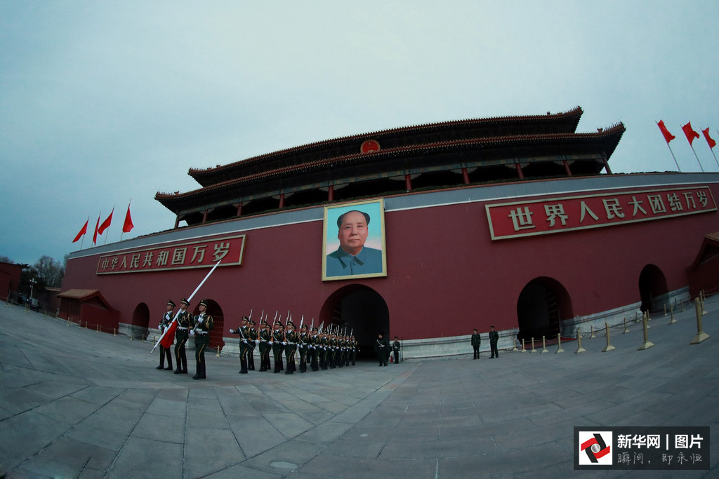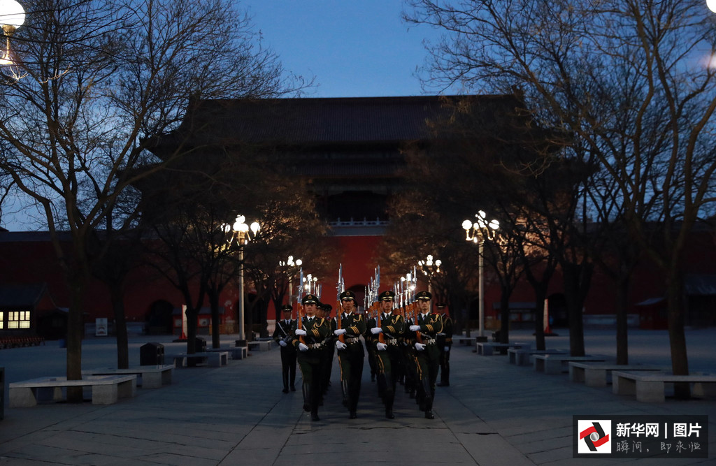 2017年3月5日,第十二屆全國人民代表大會第五次會議在人民大會堂開幕。凌晨4點(diǎn)的長安街,夜色還未褪去,位于故宮午門前一側(cè)的一座武警營區(qū)內(nèi),卻已是燈火通明。一群武警戰(zhàn)士穿起禮兵服、握緊鋼槍開始訓(xùn)練。晨曦微露,從金水橋到國旗桿下,138步、2分07秒、365天,無論雨雪風(fēng)霜、嚴(yán)寒酷暑,他們都守護(hù)著五星紅旗冉冉升起。這支部隊就是武警北京總隊天安門支隊國旗護(hù)衛(wèi)隊。