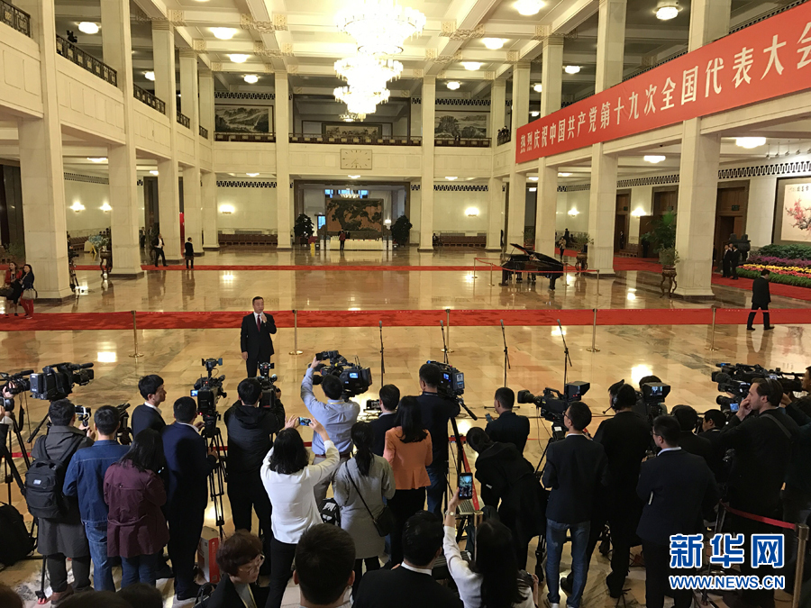10月18日,十九大新聞中心在人民大會堂舉辦“黨代表通道”第一場采訪活動。圖為采訪現(xiàn)場。新華網(wǎng) 翟子赫攝