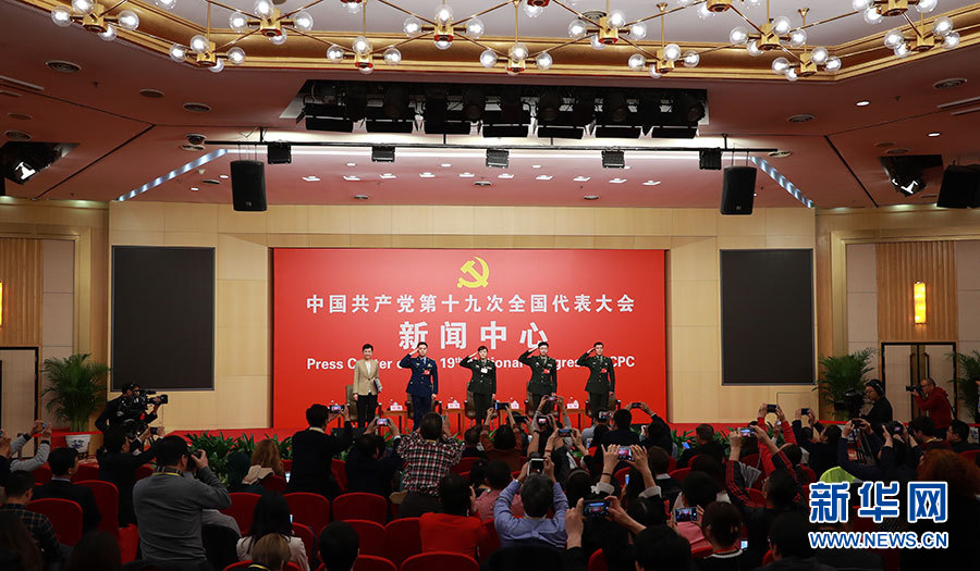 10月22日,十九大新聞中心在梅地亞中心二層新聞發(fā)布廳舉辦集體采訪(fǎng)活動(dòng),主題為“中國(guó)特色強(qiáng)軍之路邁出堅(jiān)定步伐”。圖為集體采訪(fǎng)活動(dòng)現(xiàn)場(chǎng)。新華網(wǎng) 郝廣鵬攝