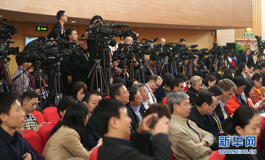 10月23日,十九大新聞中心舉辦記者招待會,邀請中央財(cái)經(jīng)領(lǐng)導(dǎo)小組辦公室副主任楊偉民,環(huán)境保護(hù)部黨組書記、部長李干杰介紹踐行綠色發(fā)展理念,建設(shè)美麗中國有關(guān)情況,并回答記者提問。圖為現(xiàn)場記者。新華網(wǎng) 郝廣鵬攝