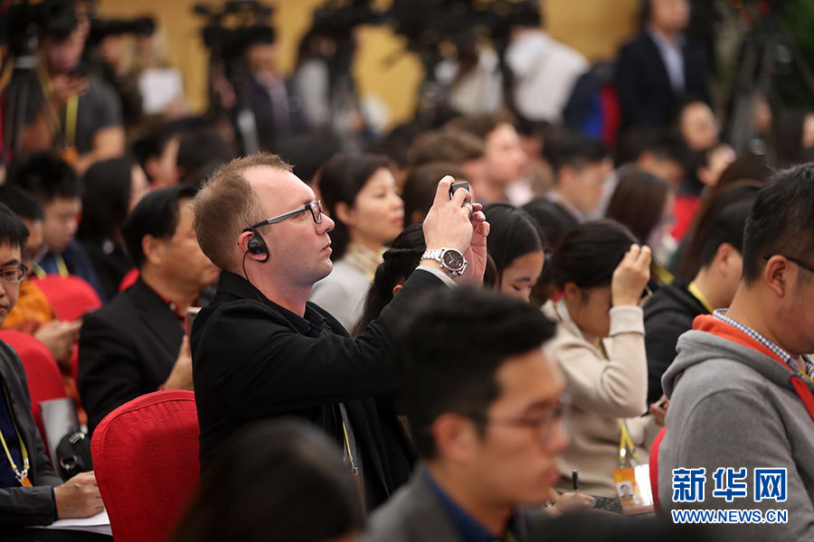 10月23日,十九大新聞中心舉辦記者招待會,邀請中央財經(jīng)領(lǐng)導(dǎo)小組辦公室副主任楊偉民,環(huán)境保護部黨組書記、部長李干杰介紹踐行綠色發(fā)展理念,建設(shè)美麗中國有關(guān)情況,并回答記者提問。圖為現(xiàn)場記者。新華網(wǎng) 郝廣鵬攝