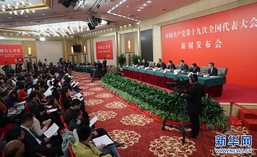 10月26日上午10:00,中國共產(chǎn)黨第十九次全國代表大會新聞發(fā)言人在梅地亞賓館二層新聞發(fā)布廳召開專題新聞發(fā)布會,請有關(guān)方面負(fù)責(zé)人解讀十九大報(bào)告,并回答記者關(guān)心的問題。圖為新聞發(fā)布會現(xiàn)場。新華網(wǎng) 翟子赫 攝