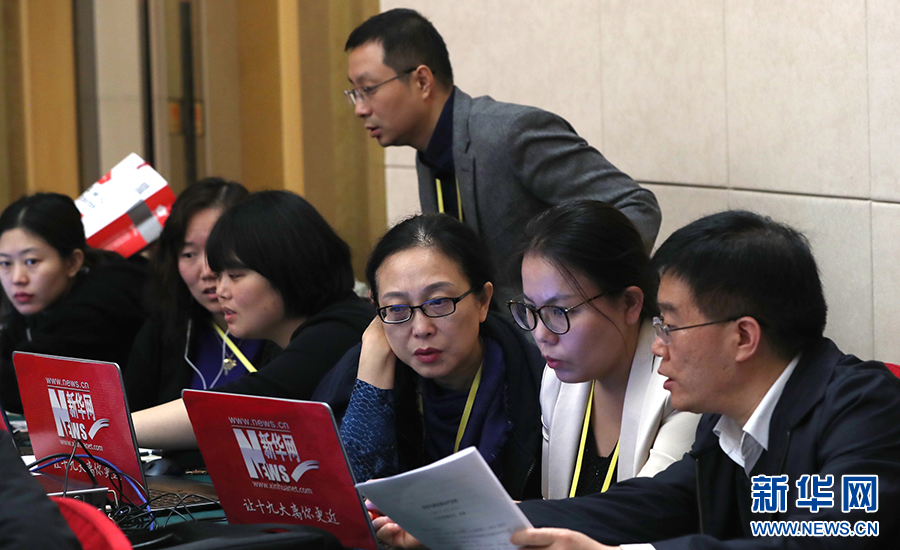 10月26日上午10:00,中國共產黨第十九次全國代表大會新聞發(fā)言人在梅地亞賓館二層新聞發(fā)布廳召開專題新聞發(fā)布會,請有關方面負責人解讀十九大報告,并回答記者關心的問題。圖為新華網(wǎng)在現(xiàn)場直播。新華網(wǎng)?翟子赫 攝