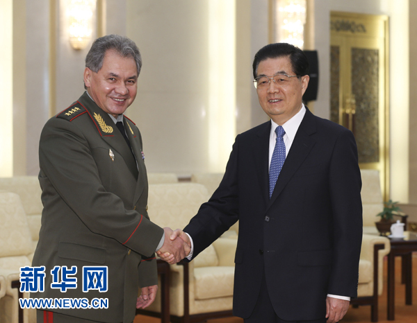 11月21日,國(guó)家主席胡錦濤在北京會(huì)見(jiàn)俄羅斯國(guó)防部長(zhǎng)紹伊古。新華社記者蘭紅光攝