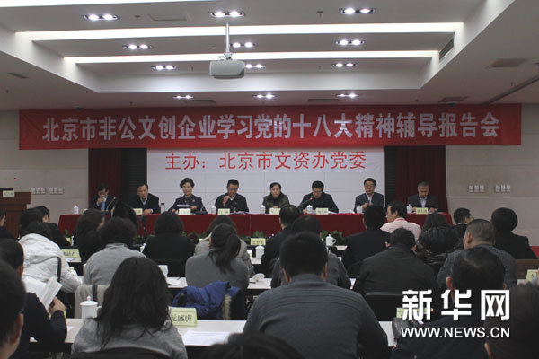 ?? 27日,北京市文資辦召開非公有制文化創(chuàng)意企業(yè)學習宣傳黨的十八大精神輔導報告會。圖為會議現(xiàn)場。新華網(wǎng)記者 陳元攝