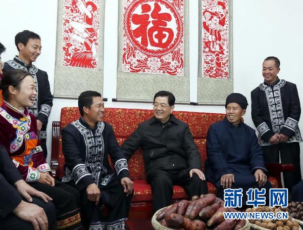 ????12月1日至6日,國(guó)家主席胡錦濤在貴州考察工作。這是胡錦濤在畢節(jié)市黔西縣烏騾壩村親切看望布依族村民潘安平一家。 新華社記者 鞠鵬 攝